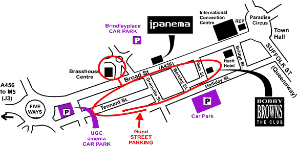 Street parking is plentiful on Tennant St, Granville St, Berkley St & Gas St. At worst, there are good public car parks open at night in Five Ways New UGC cinema, and in Brindleyplace. |